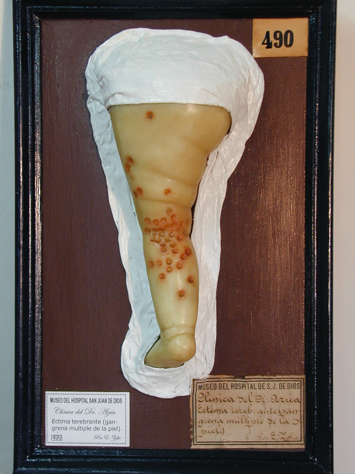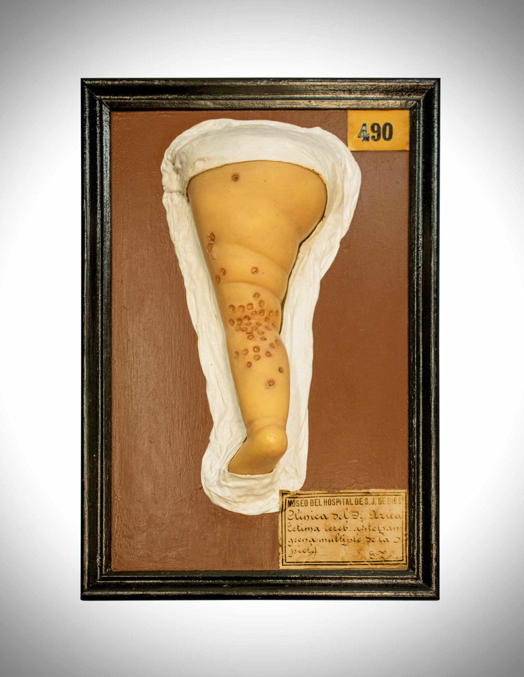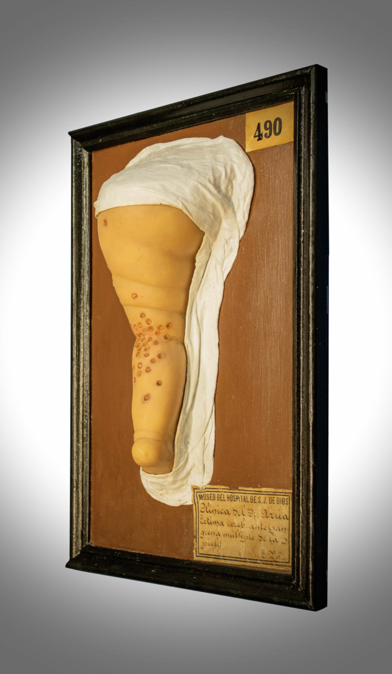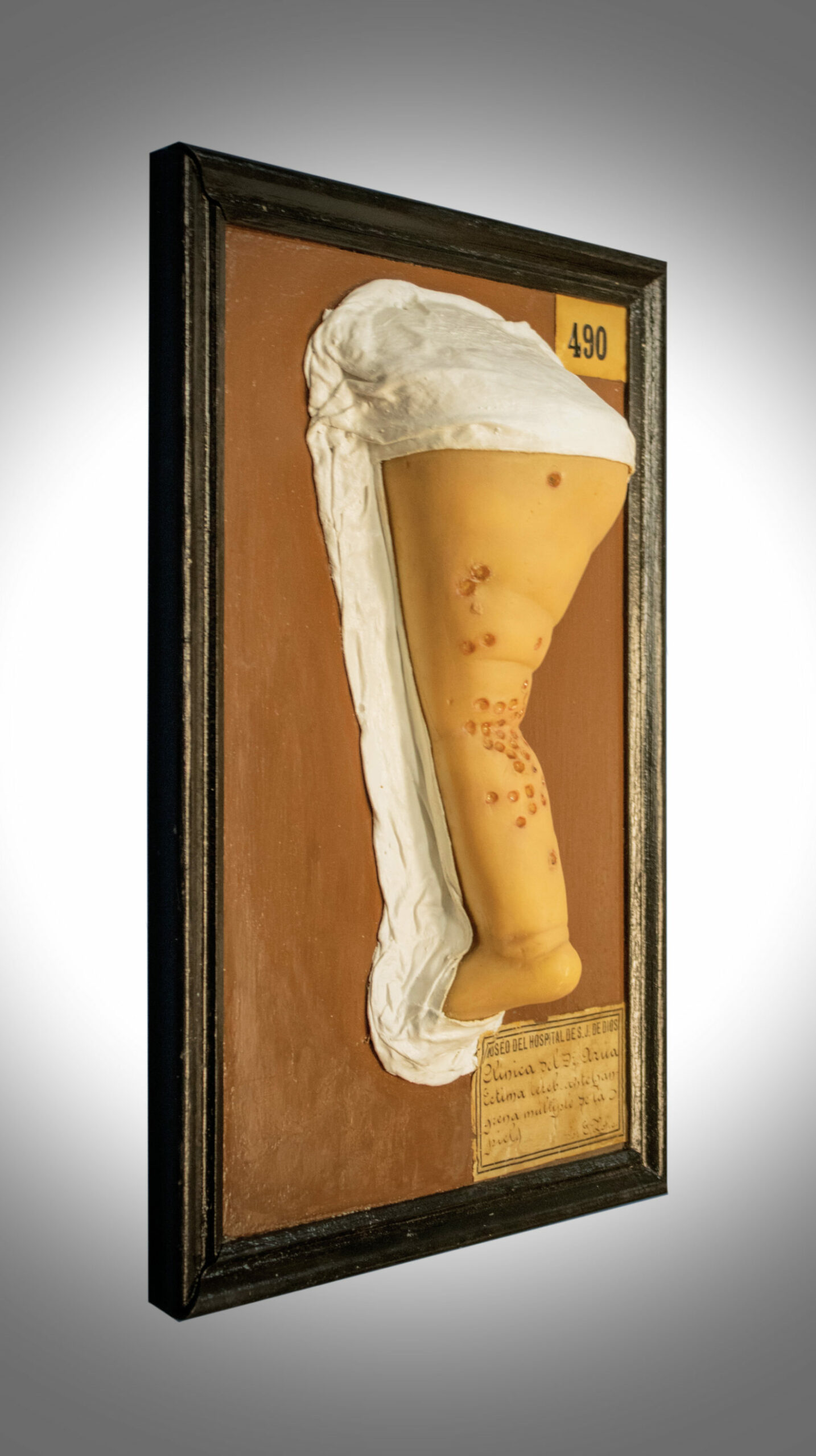 Molde de cera que representa la extremidad inferior izquierda de un niño en su parte posterior. En esta pieza destacan una serie de formaciones circulares, ulcerosas del tamaño de lentejas, en la superficie de la piel y de color rojo intenso. Además de estas lesiones pueden observarse úlceras necróticas con el borde enrojecido. Su localización es principalmente en la corva y pantorrilla aunque se pueden distinguir en menor número, en la zona glútea y parte exterior del muslo.