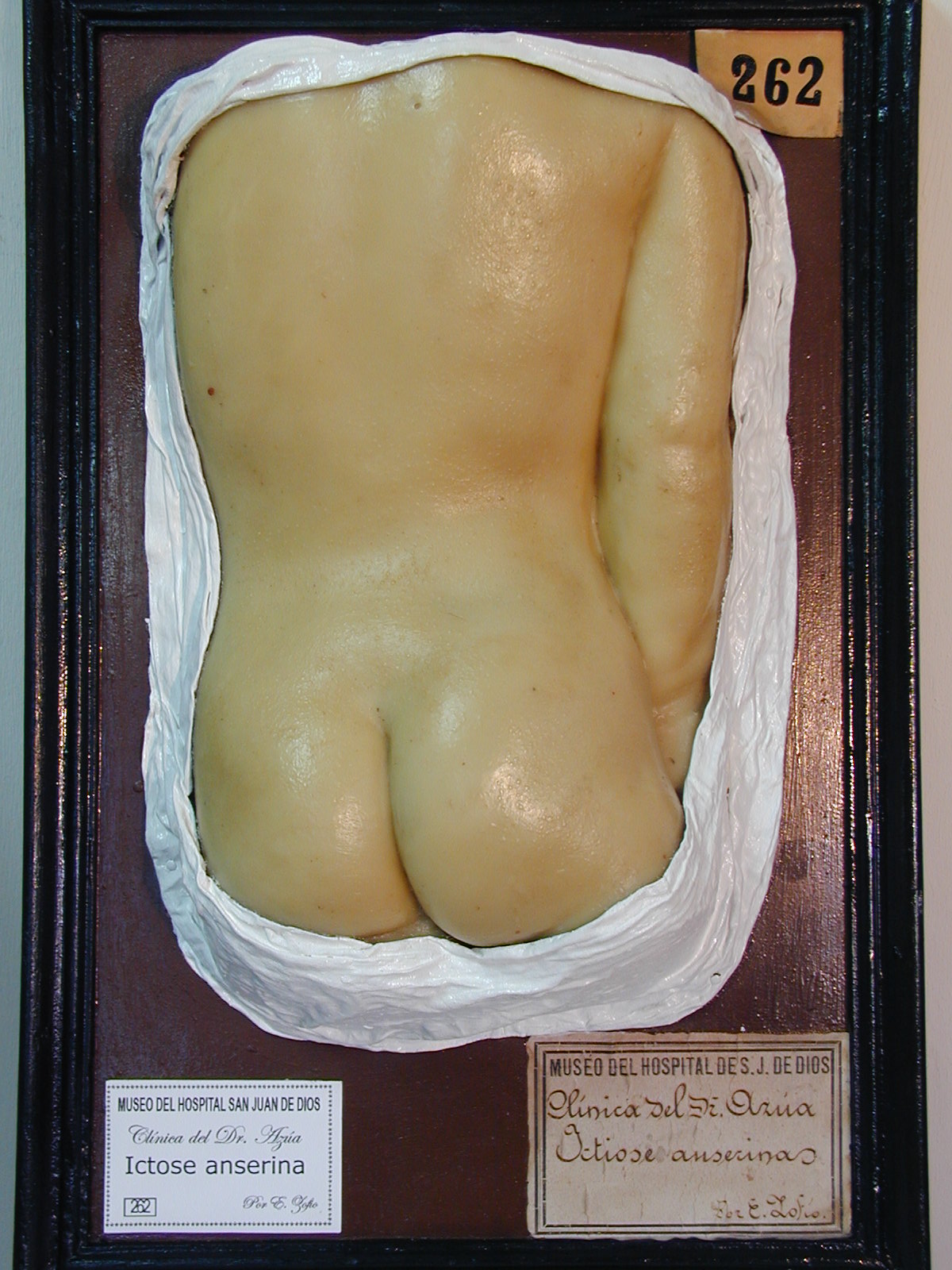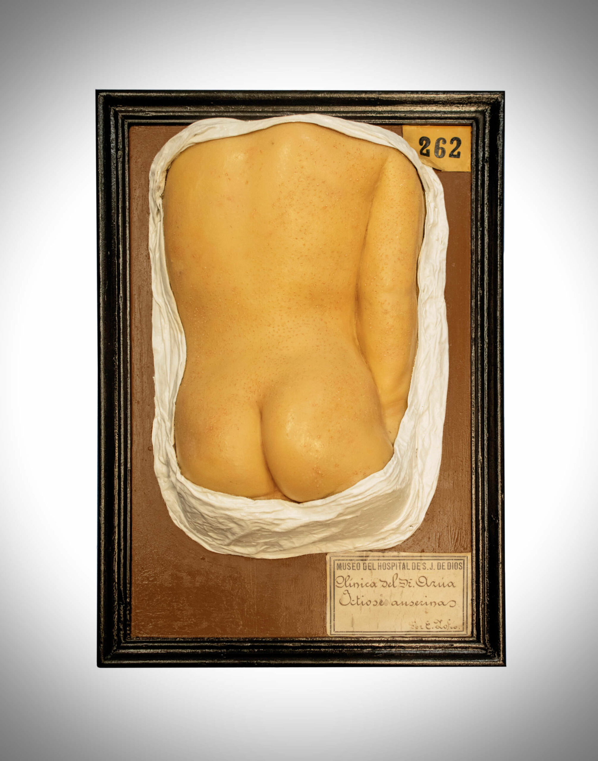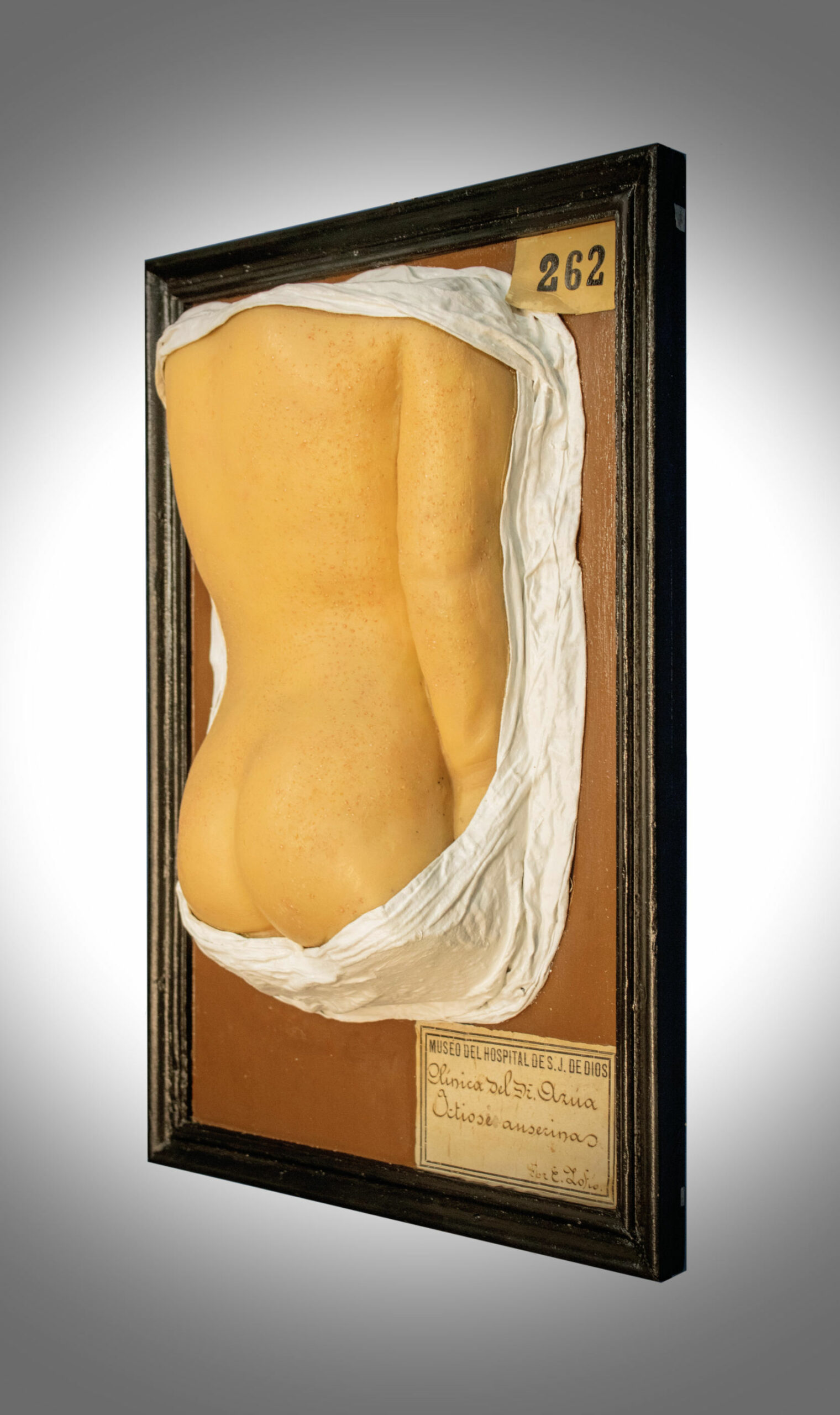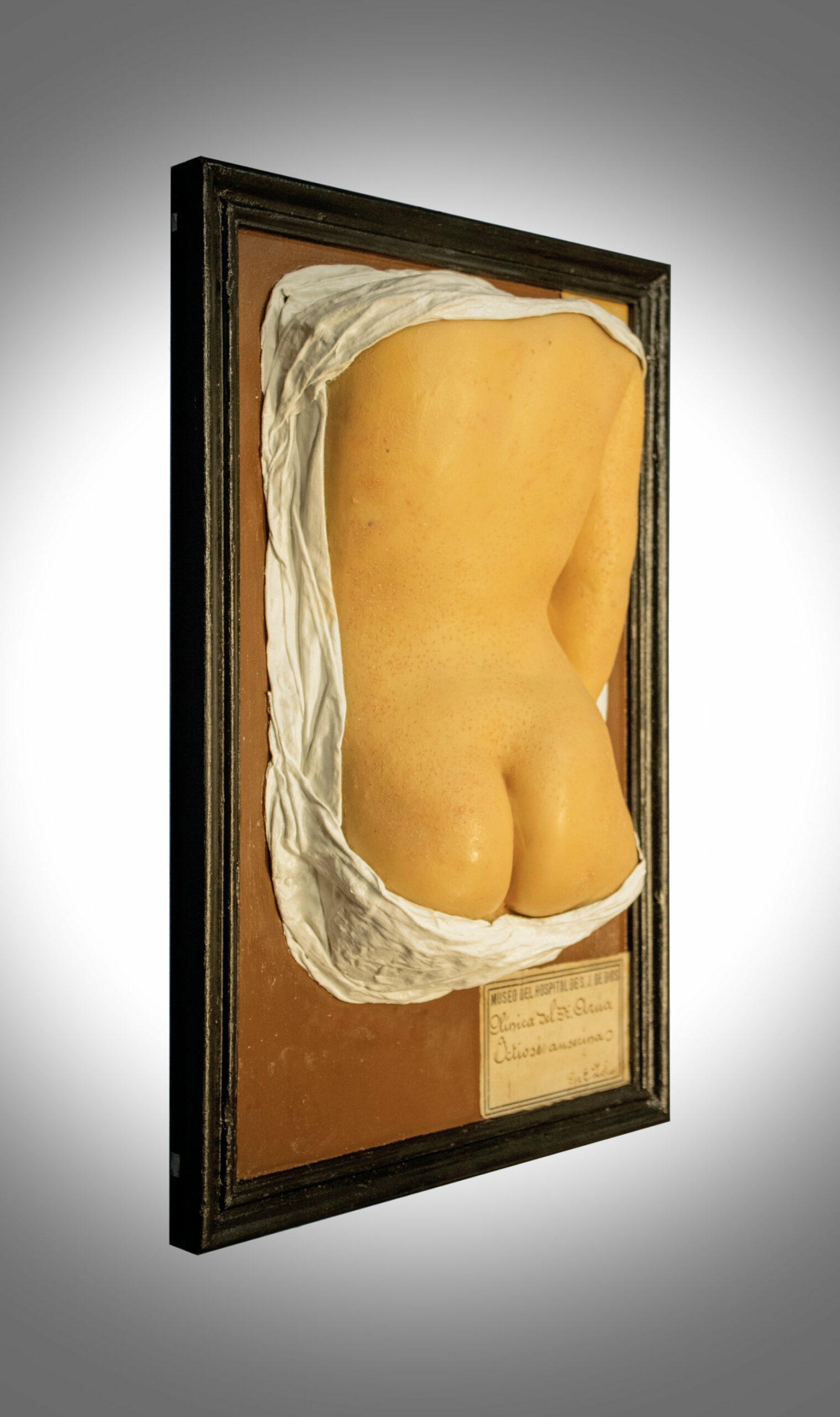 Molde de cera que representa la espalda, el brazo y hombro derechos, y los glúteos de un individuo. El modelado es una medida inferior a la medida natural. En esta figura se aprecia, pequeñas protuberancias secas de color rojizo y marrón, que se extienden de manera uniforme por toda la superficie de la piel.