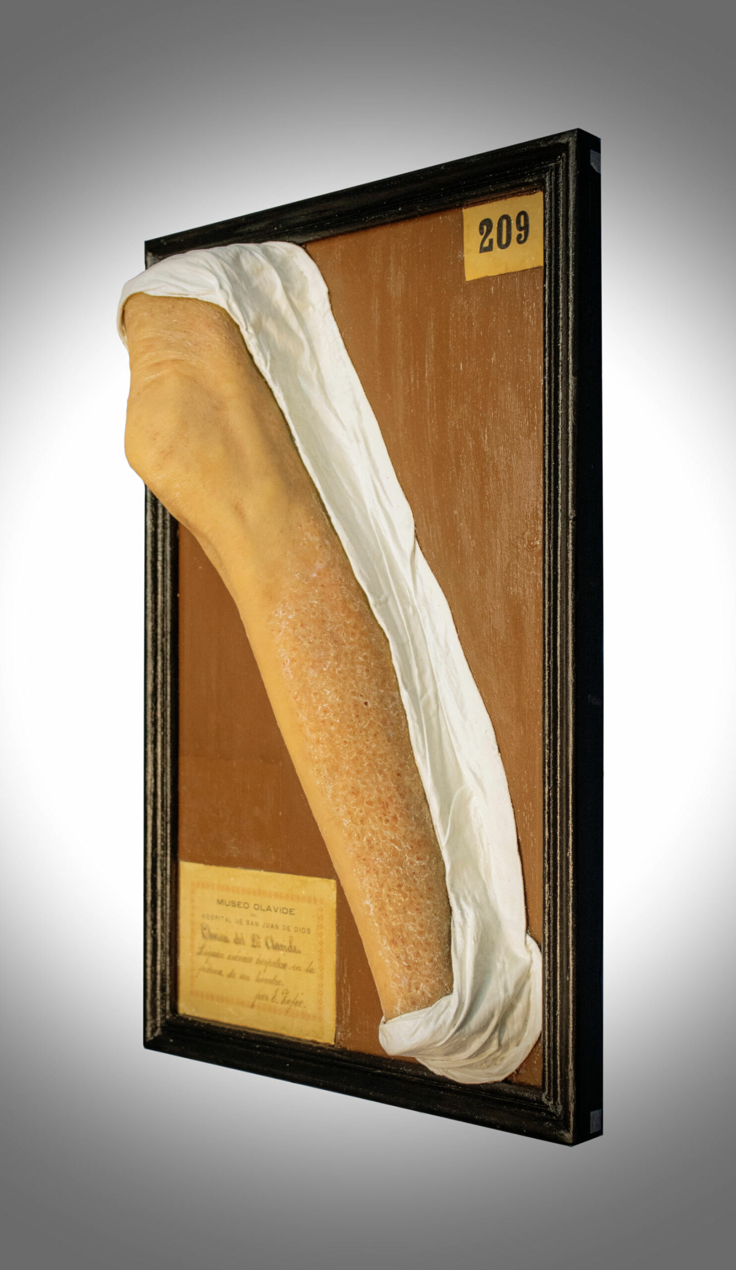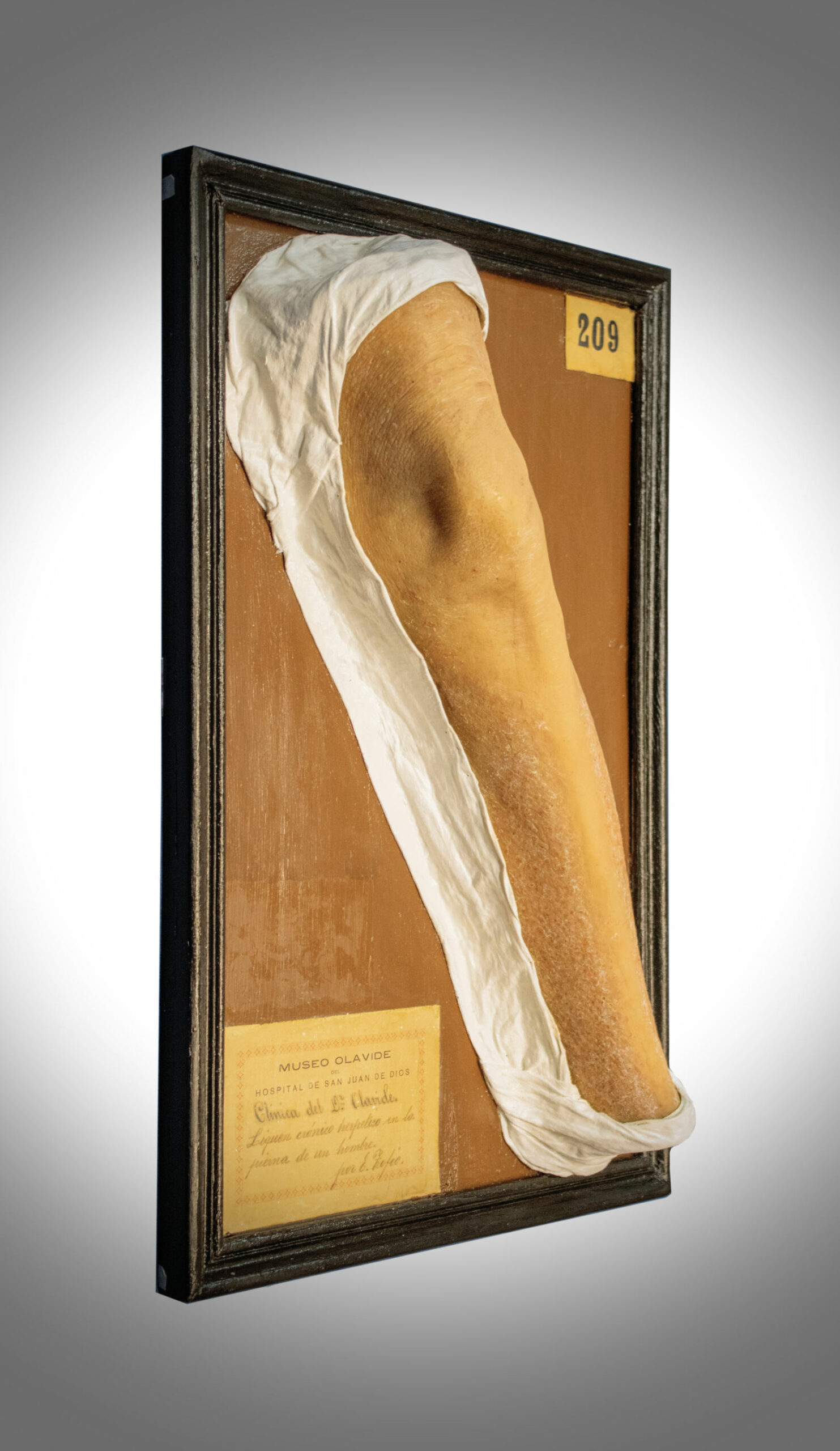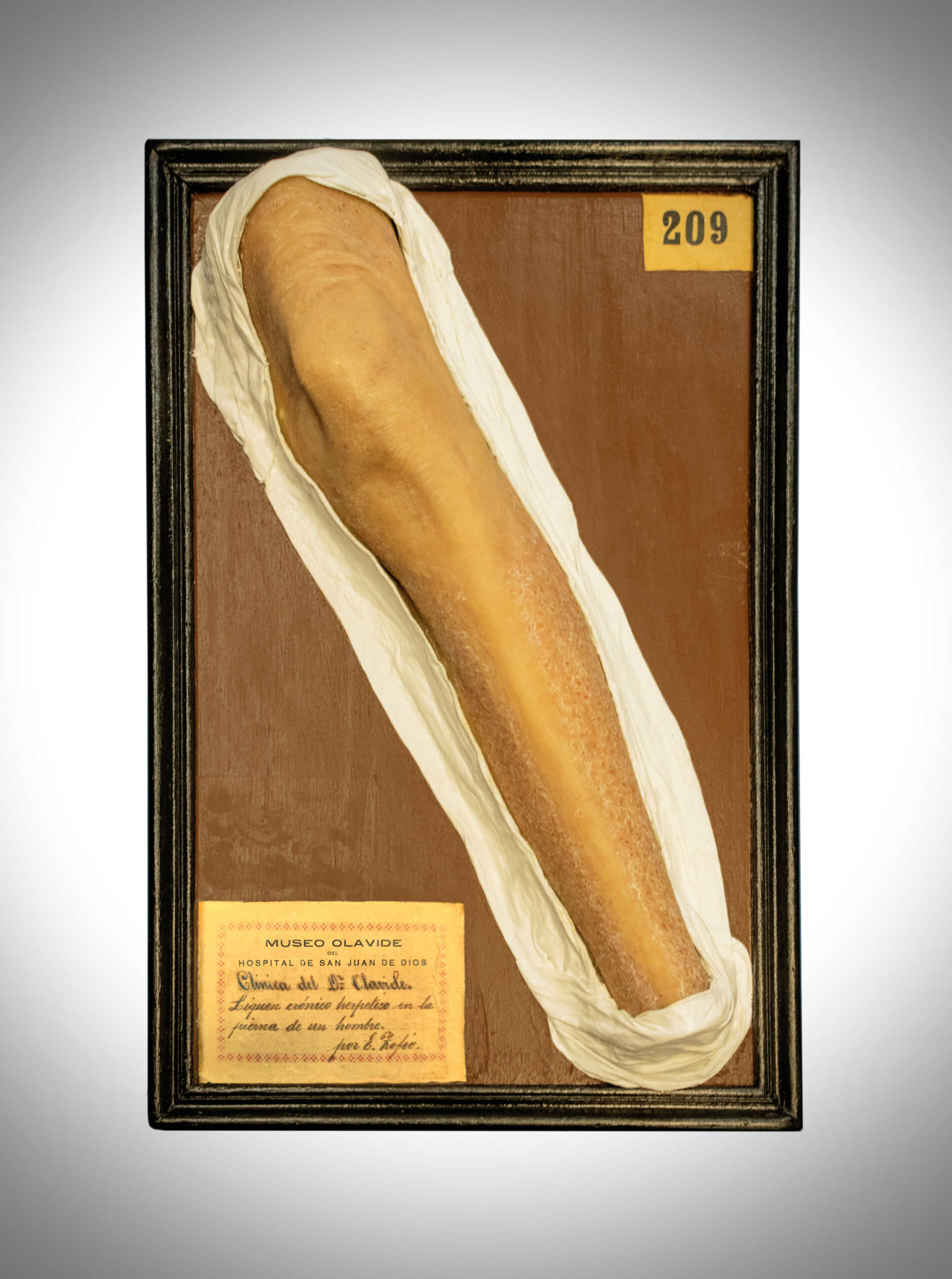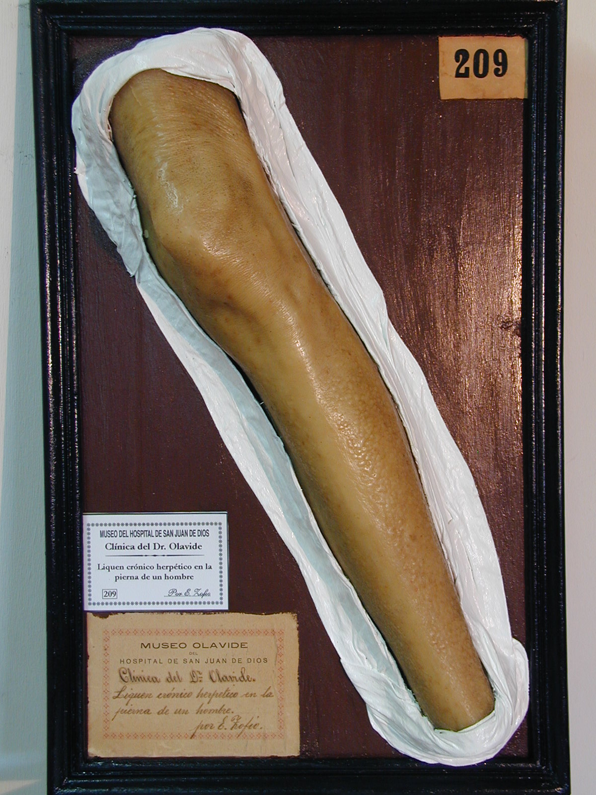 Modelado de cera que representa la pierna derecha de un individuo en posición frontal. En la piel puede observarse una erupción punteada de pequeñas pápulas confluentes, escamosas, de color rojo oscuro en el ápice. La piel, en los espacios que quedan libre de lesiones, aparece engrosada y seca.