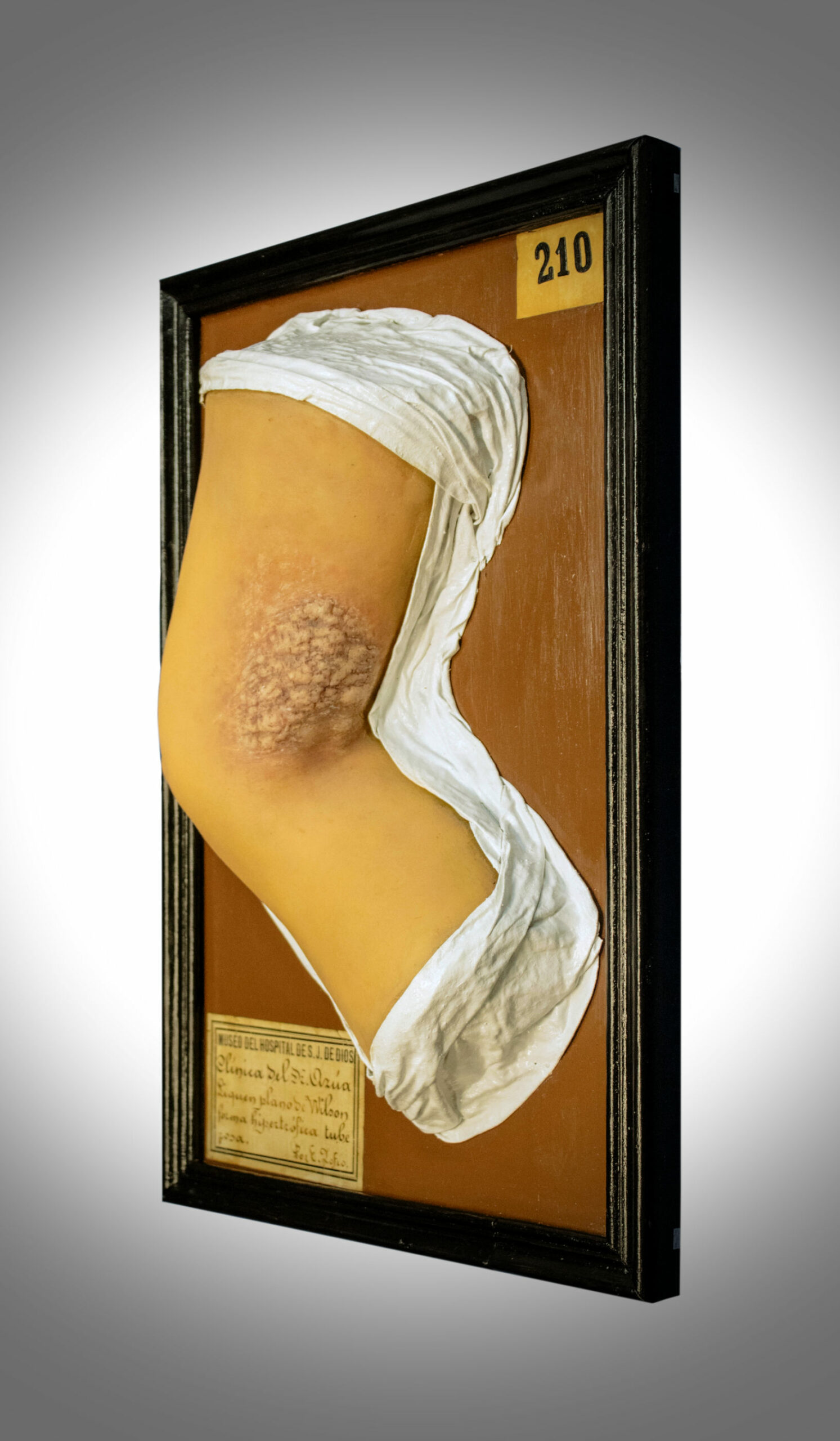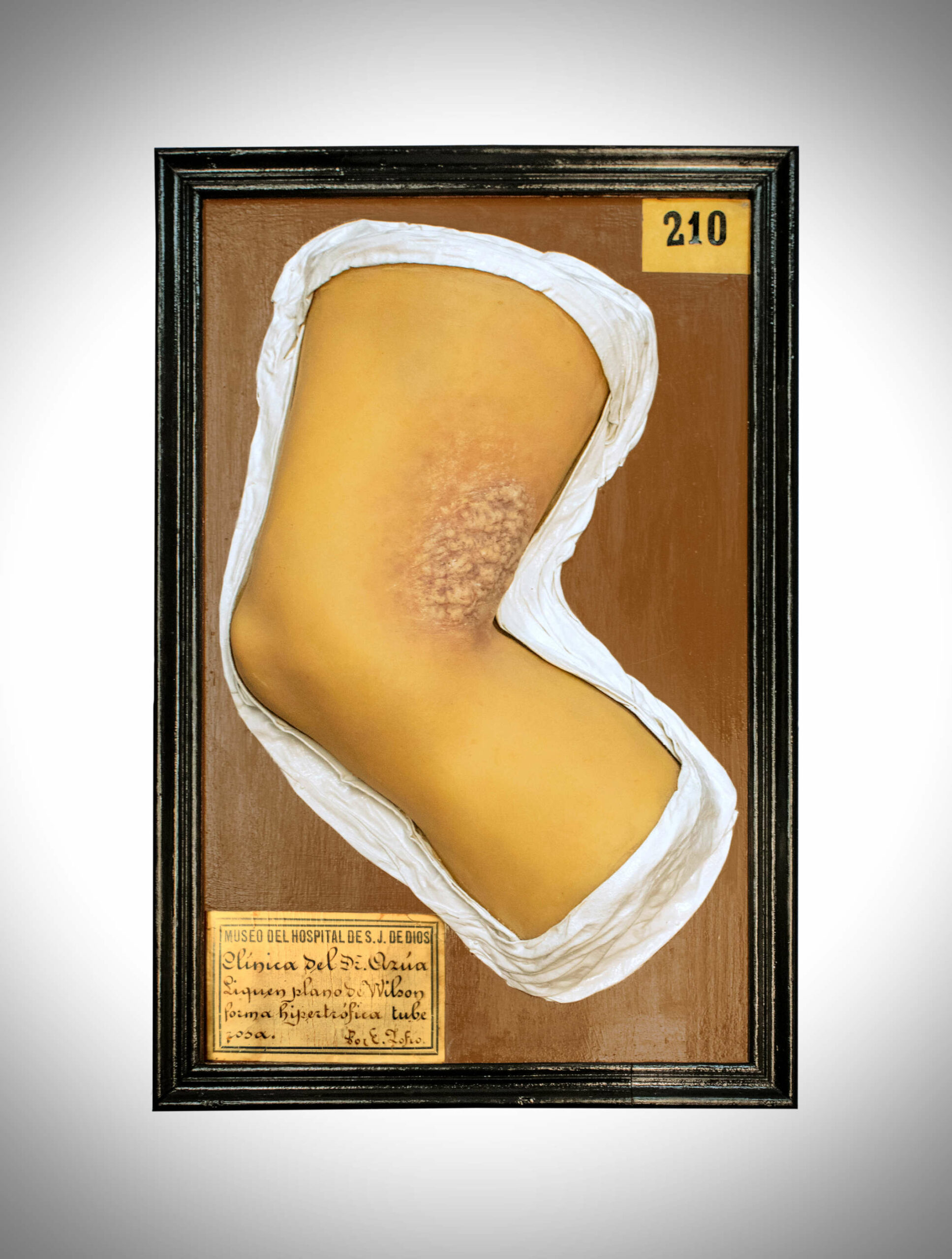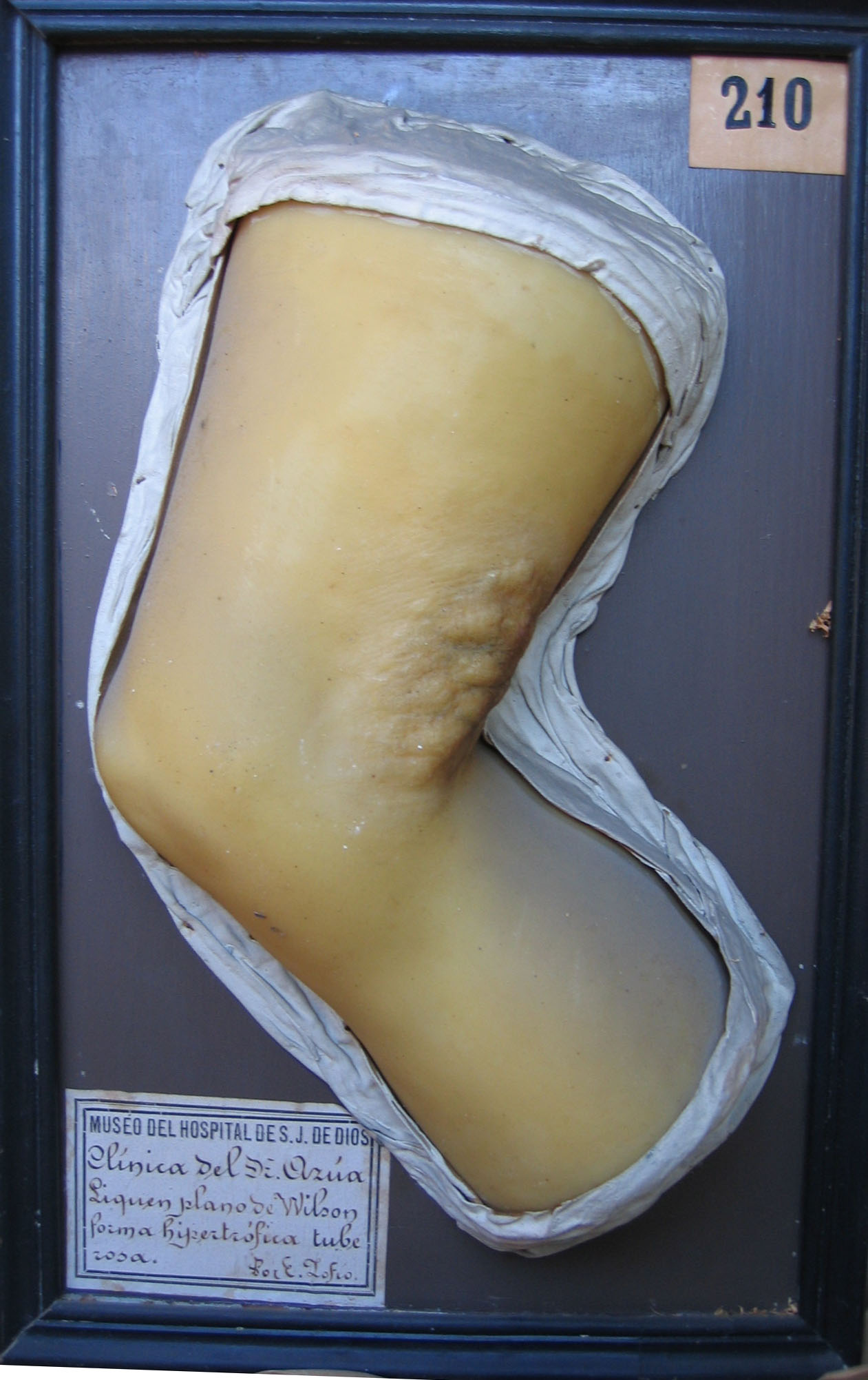Molde de cera que representa la mano y antebrazo derecho en su cara dorsal con la quinta falange en semiflexión. La figura muestra una lesión abultada de forma circular de unos 4 cm de diámetro situada en la zona media del antebrazo, que presenta un aspecto irregular de color rojizo con zonas purulentas y bordes bien definidos y engrosados. El resto de la piel es normal, y se presenta envejecida, arrugada y con manchas.