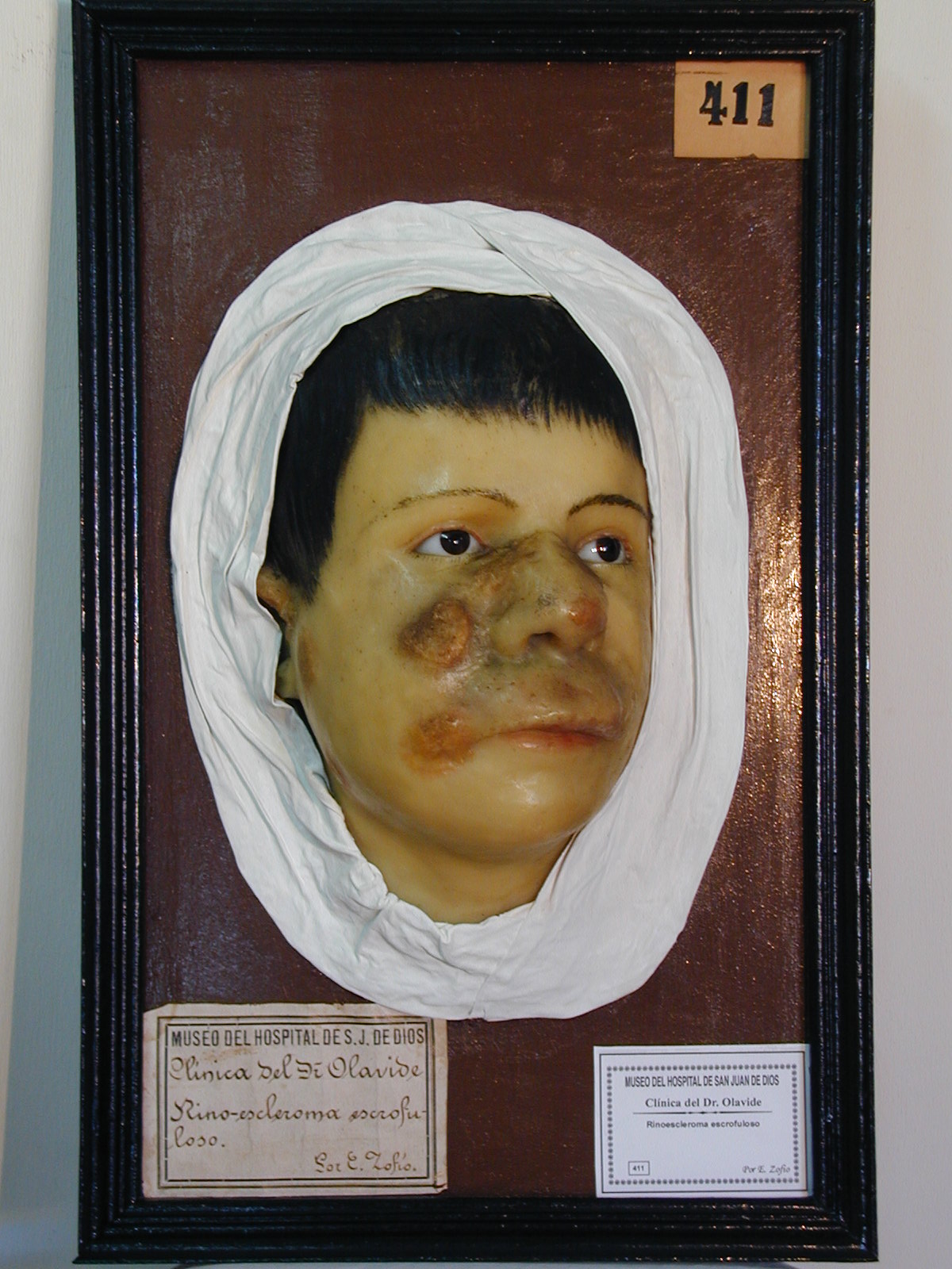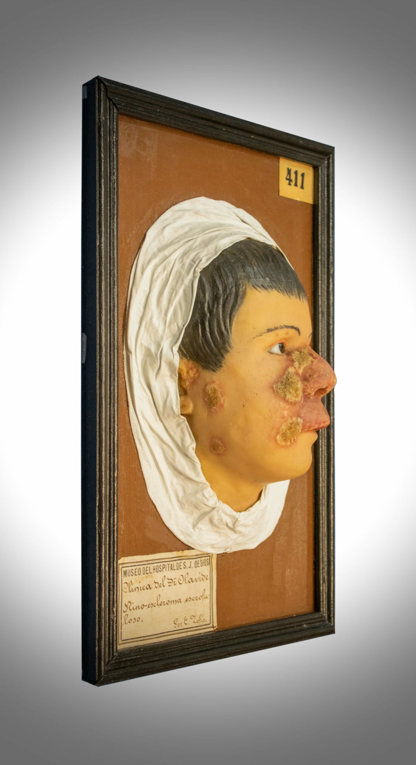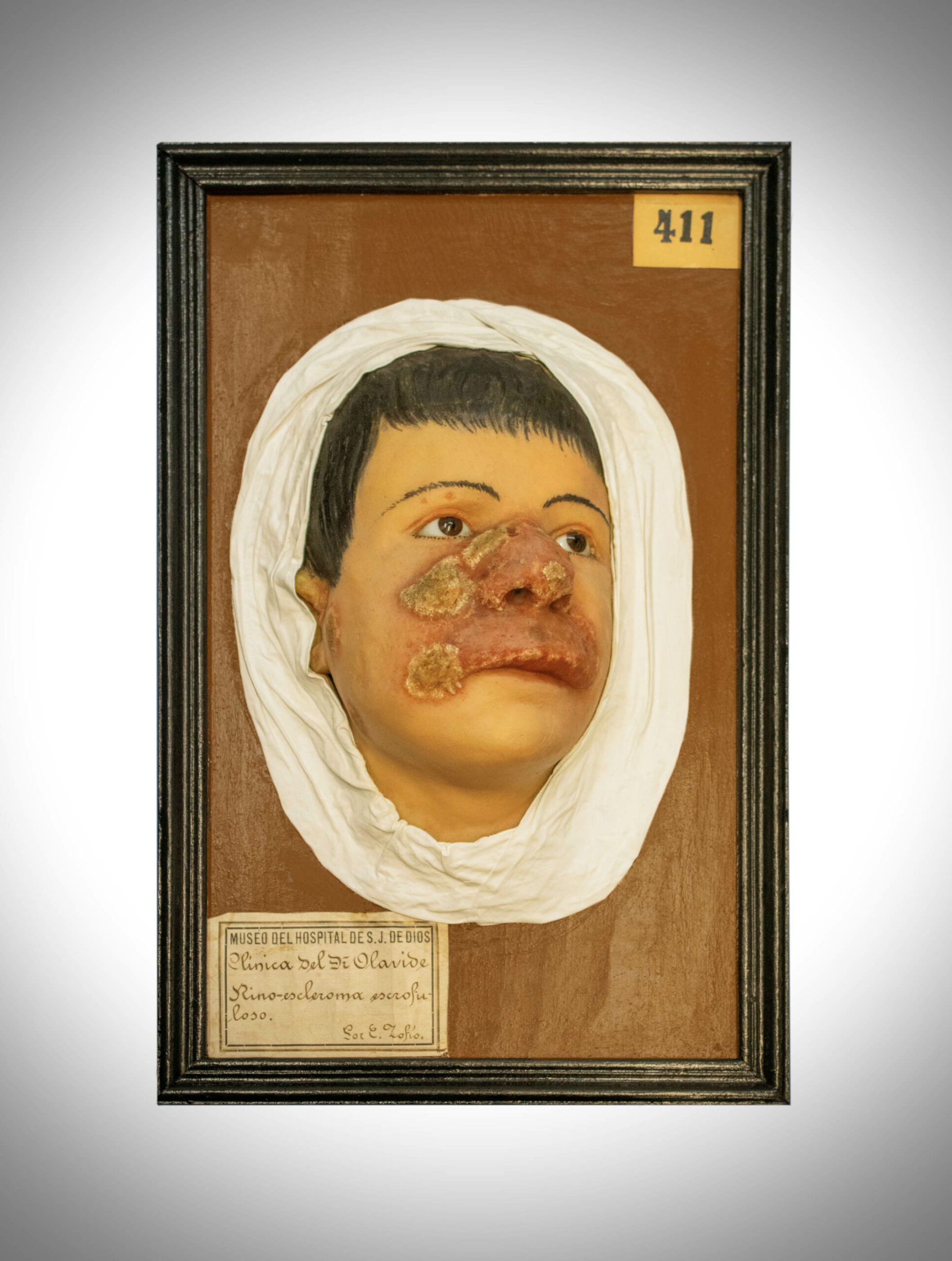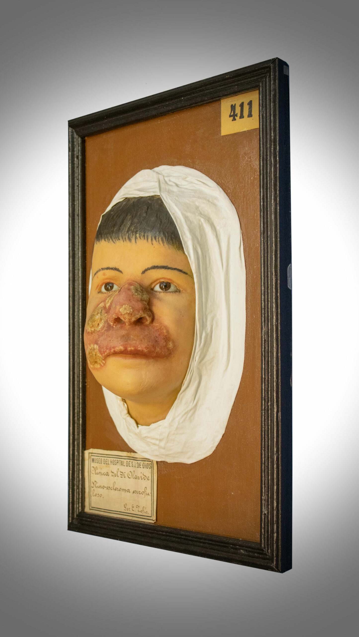 Molde de cera que representa la cara de un hombre. Presenta una tumefacción violácea que se extiende por la nariz, labios y mejillas. Así mismo, pueden observarse una serie de lesiones costrosas, de gran tamaño, y coloración amarillo-parduzca que se sitúan en la punta de la nariz, mejilla y comisura de los labios.