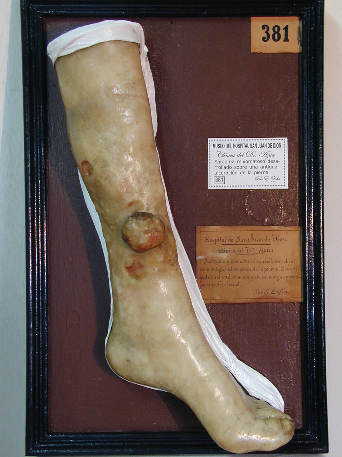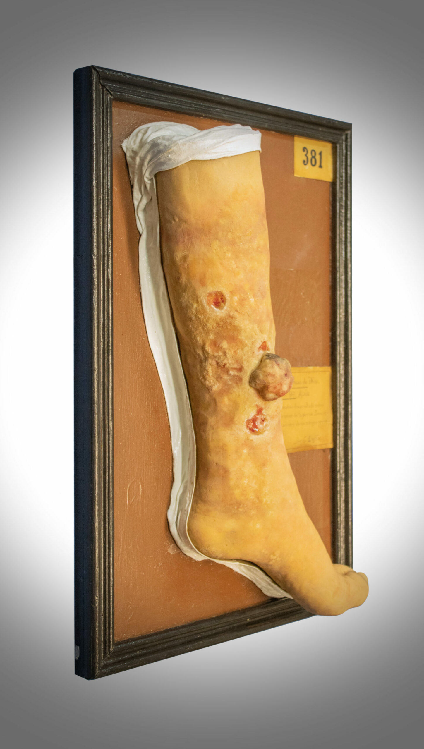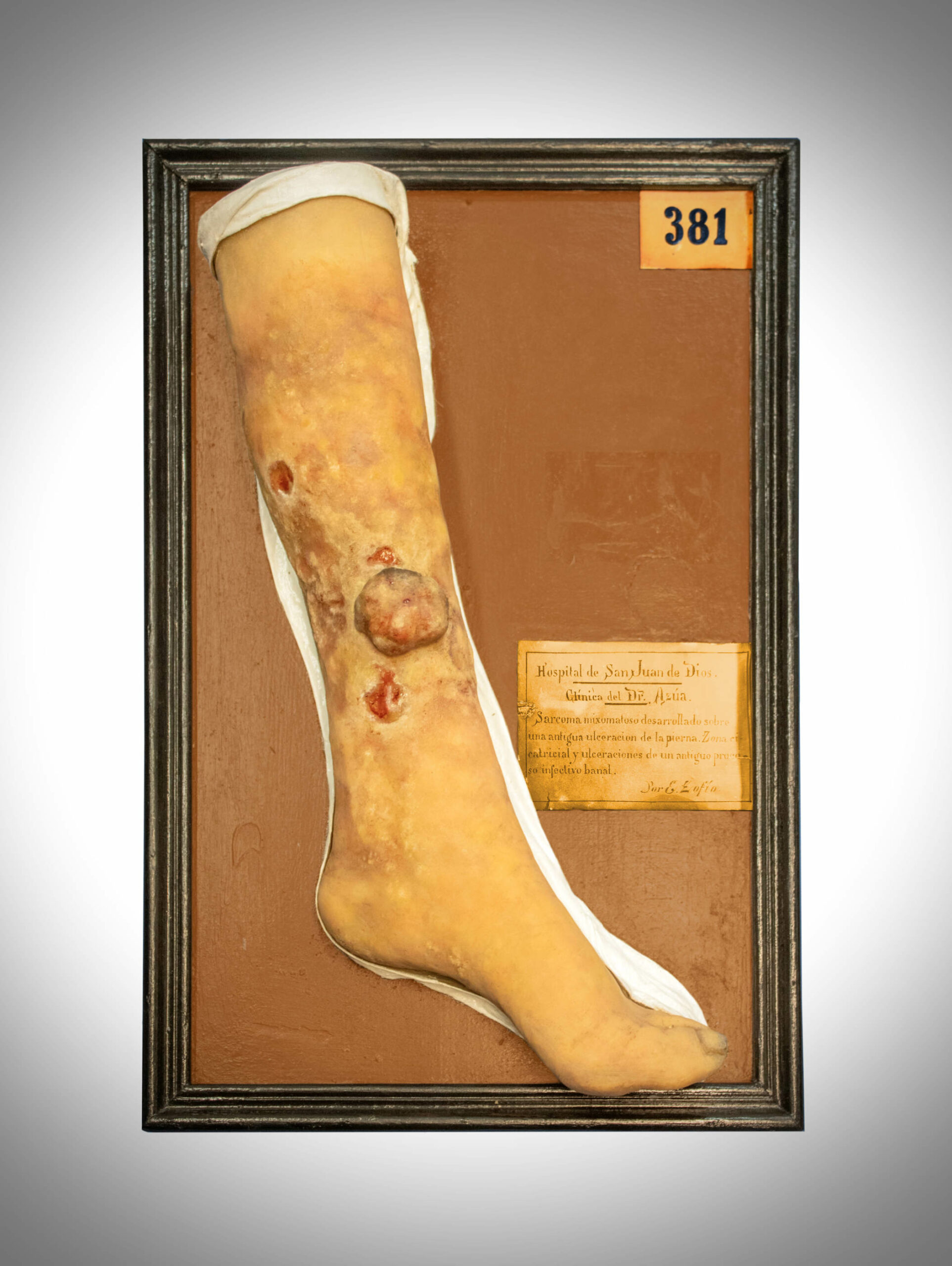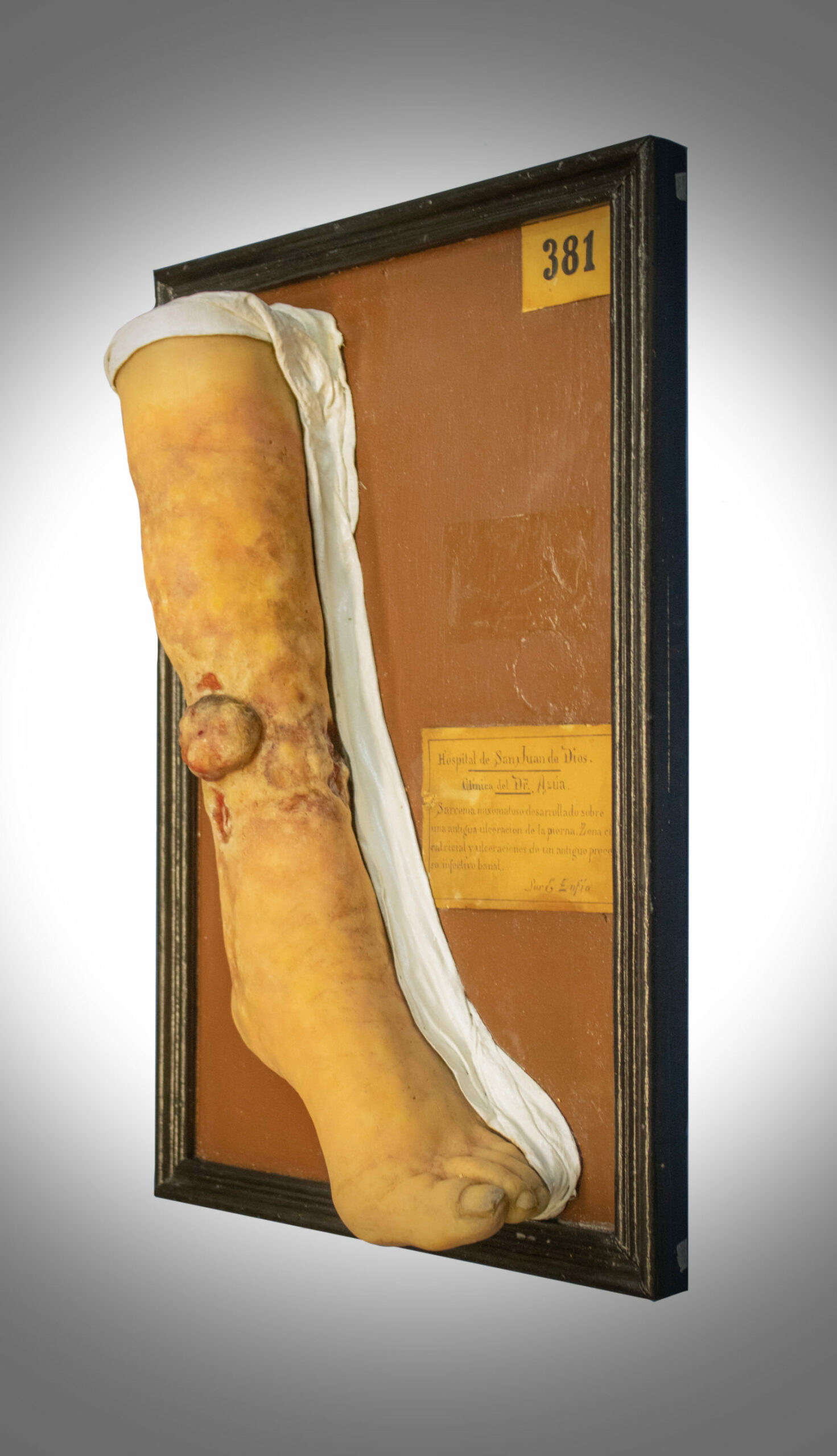 Modelado de cera que representa la parte lateral interna de pierna y pie de un individuo. En el tercio distal de la tibia se puede observar una formación tumoral de gran tamaño, sobre elevada, esférica, de aspecto rugoso y coloración que alterna desde una tonalidad ocre hasta un pardo oscuro pasando por tonos rojizos. El tumor se asienta sobre una superficie de la piel que se presenta rugosa, oscura y que se extiende por el tercio medial y distal de la tibia. Diversas úlceras de distinto tamaño y consideración, así como restos cicatriciales de las mismas aparecen en el margen superior de la piel erosionada.
