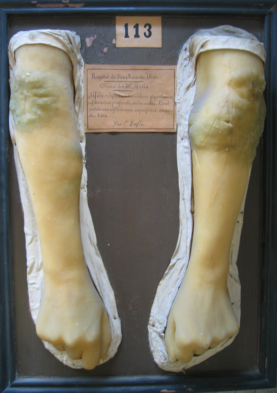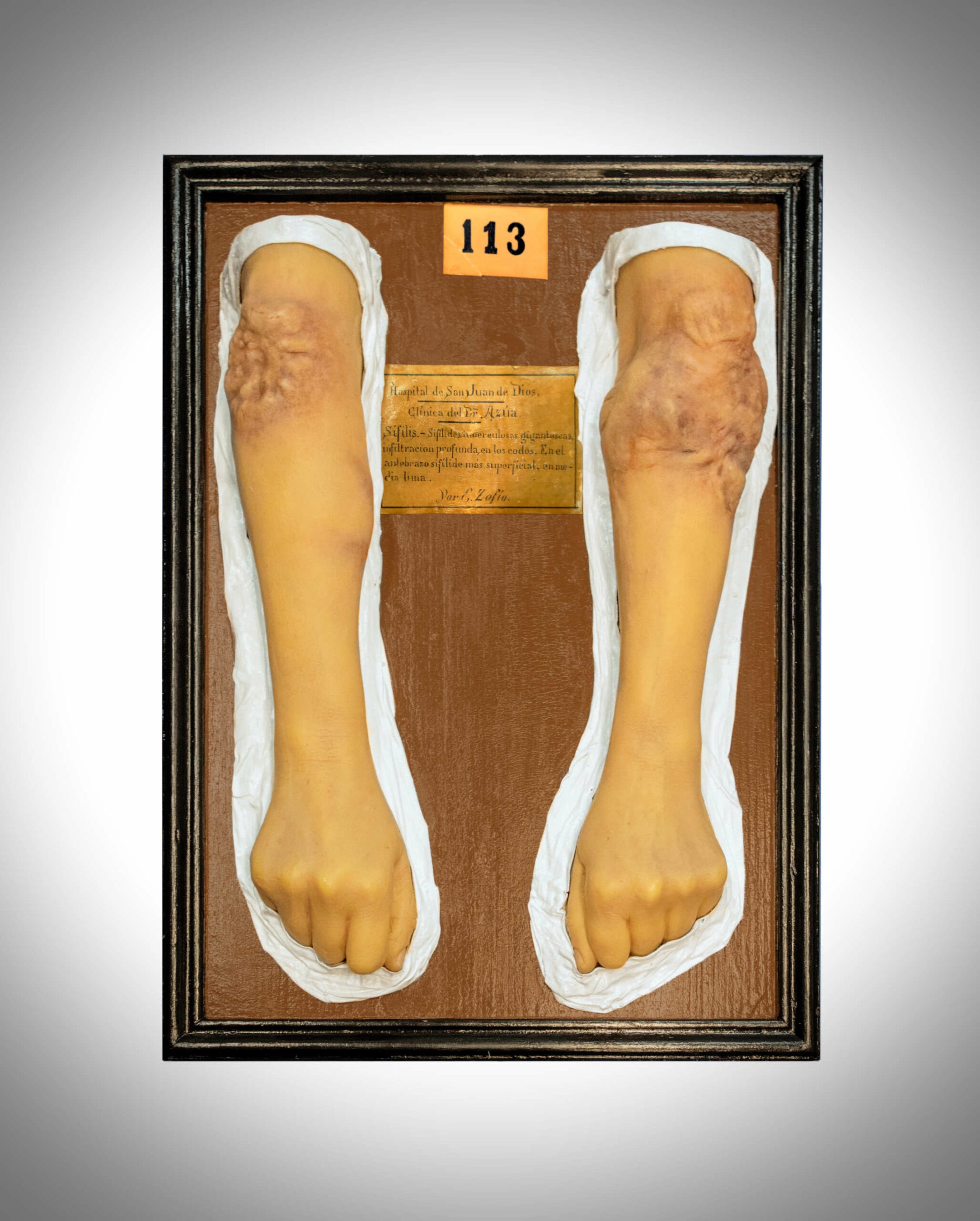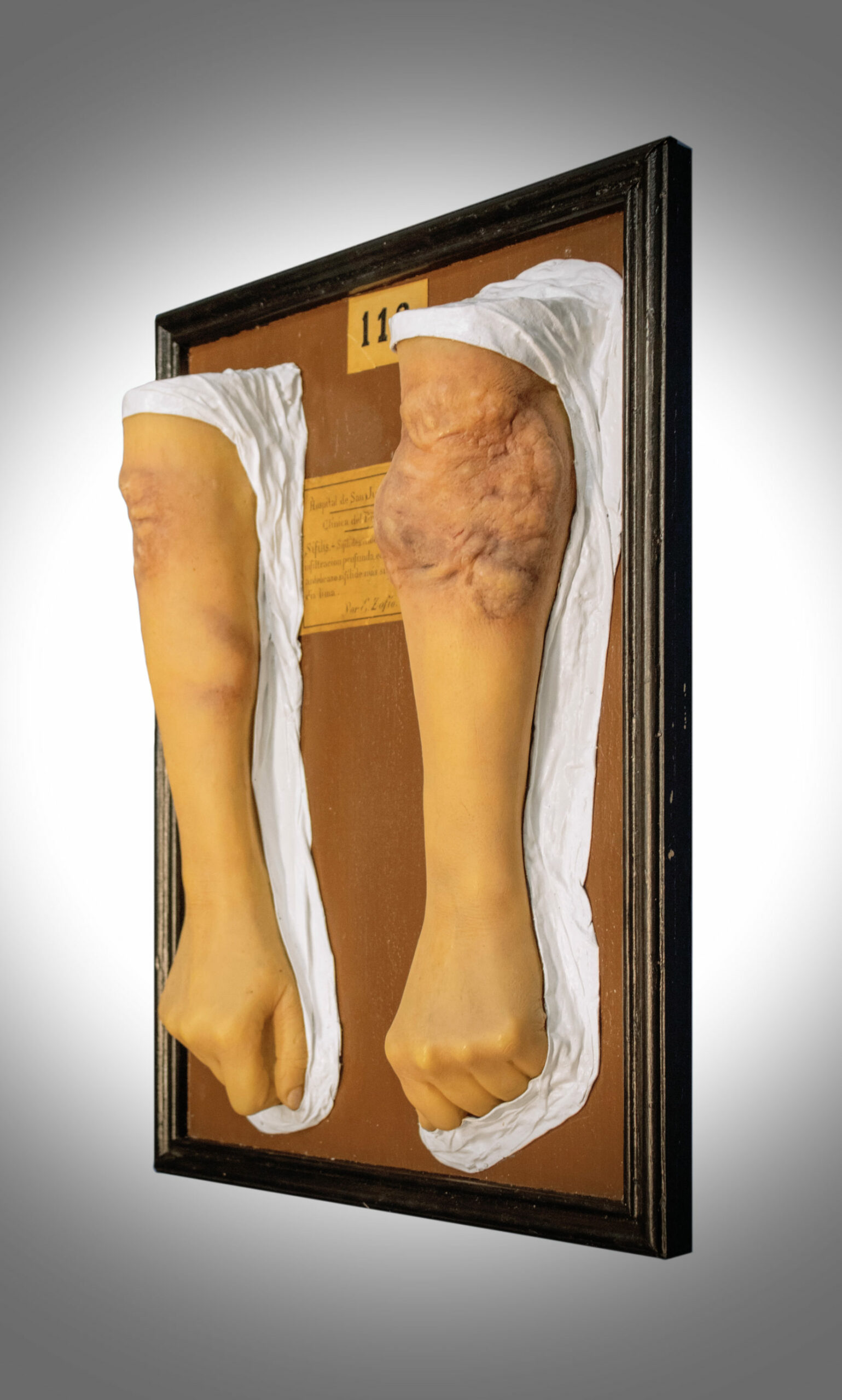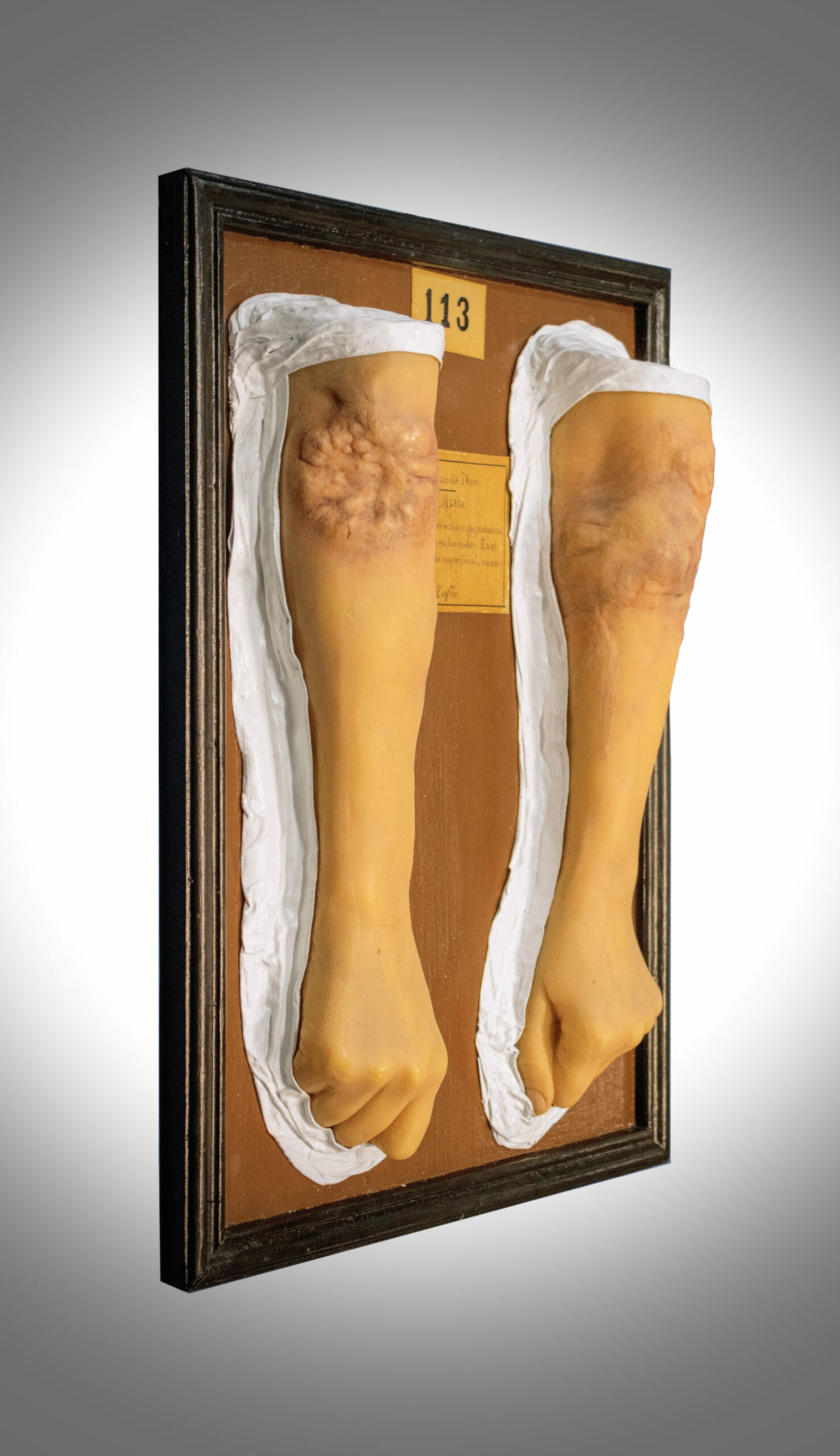 Molde de cera que representa los brazos de un individuo con las manos cerradas a modo de puño en posición frontal. En el extremo superior de los brazos, a la altura de los codos, se observan unas formaciones sobre elevadas, de gran tamaño, color rojizo y bordes irregulares cuya cicatrización se extiende desde el exterior al interior de la lesión. En el brazo derecho, junto con las formaciones anteriormente descritas, la piel aparece oscurecida, engrosada, con textura irregular.