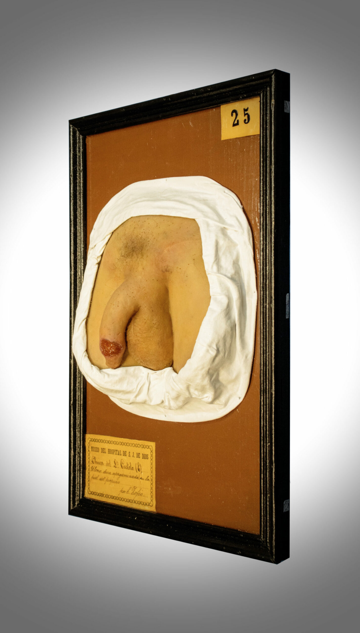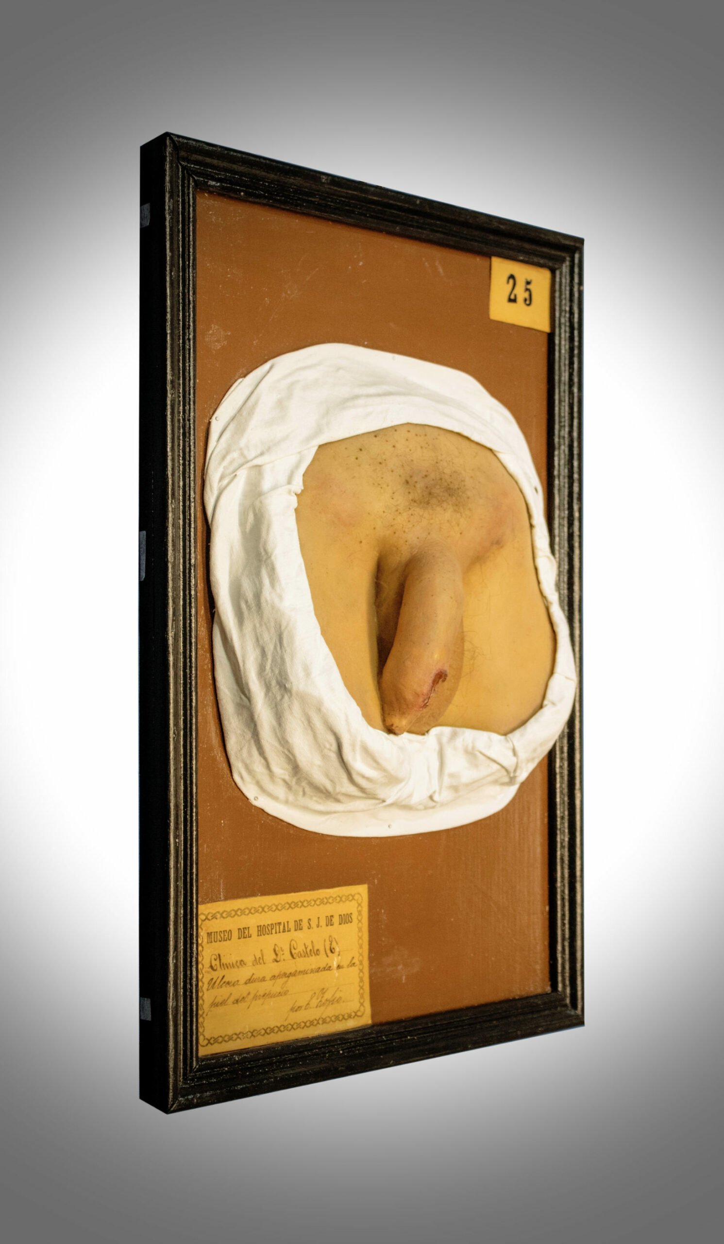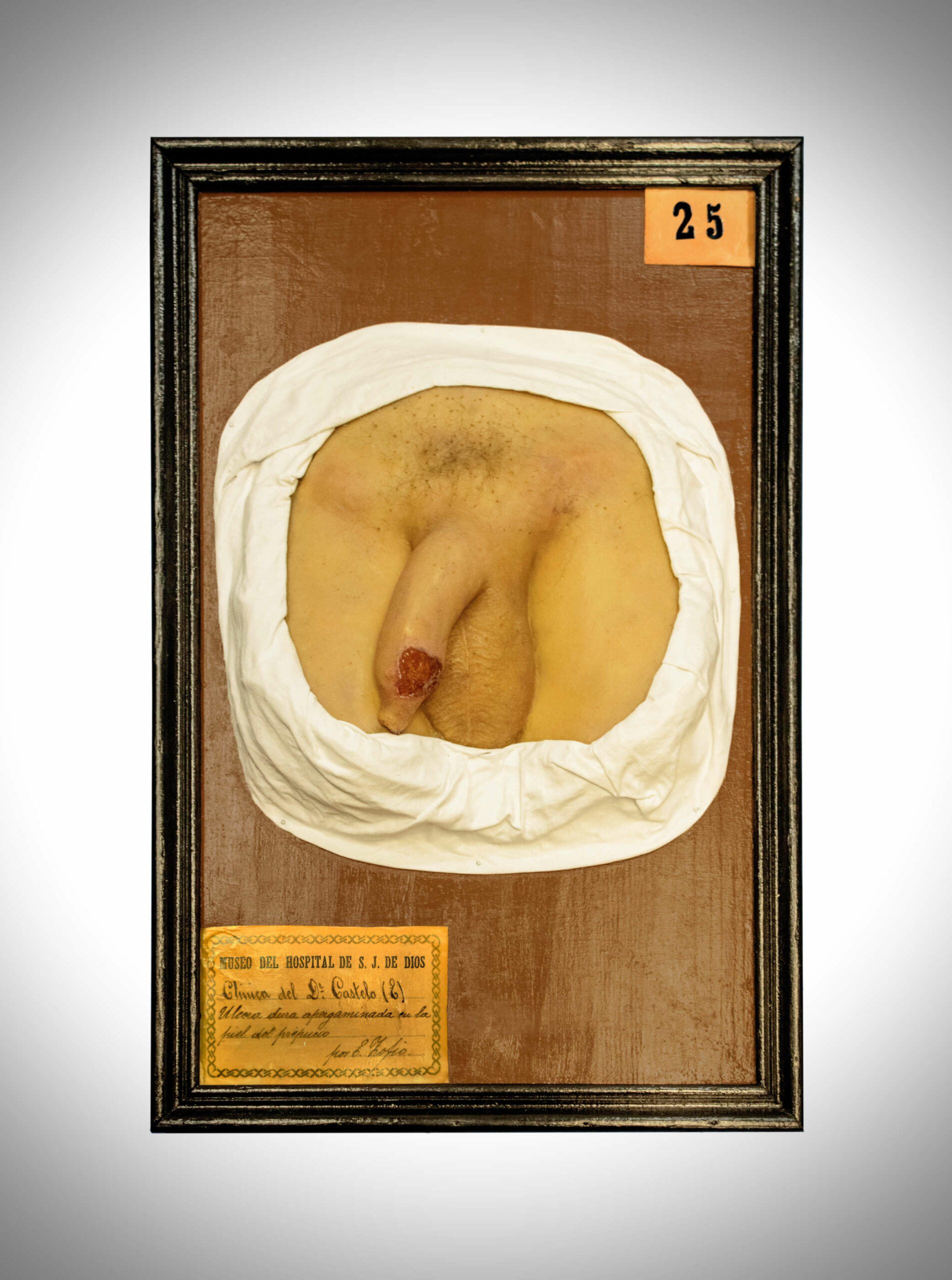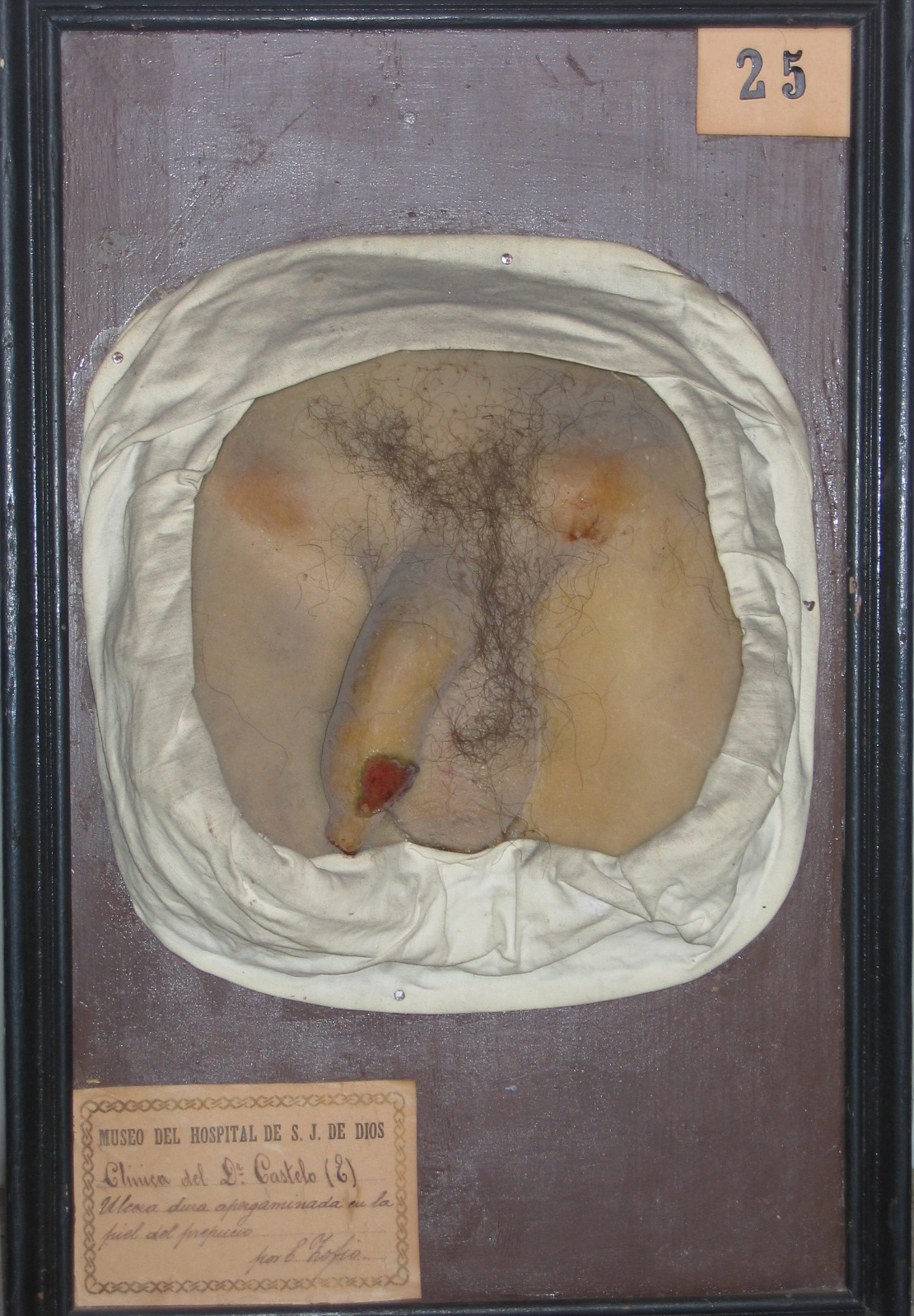 Consta de un molde de cera que representa los genitales externos de un hombre con el miembro ligeramente ladeado a la izquierda con el propósito de mostrar la ulceración presente en el prepucio del paciente. Dicha lesión del tamaño de una moneda, irregular en la forma, con los bordes bien definidos y fondo rojo oscuro y aspecto brillante. Los ganglios inguinales se presentan enrojecidos e inflamados.